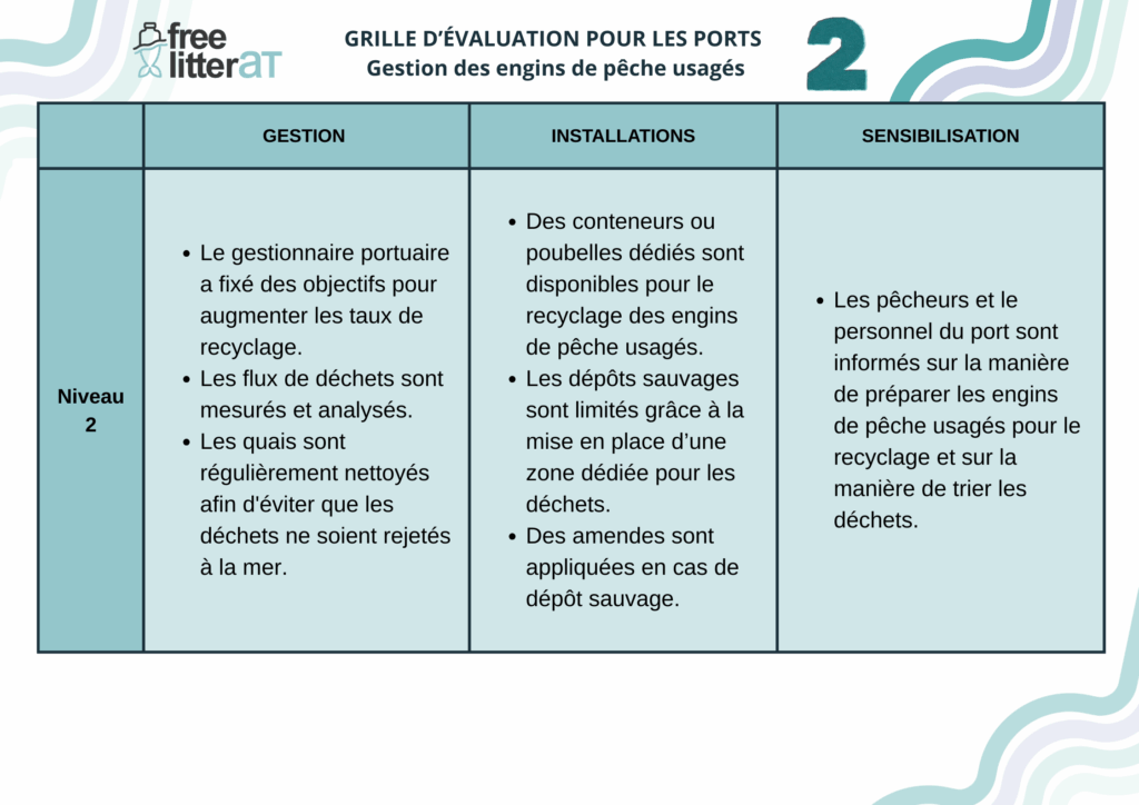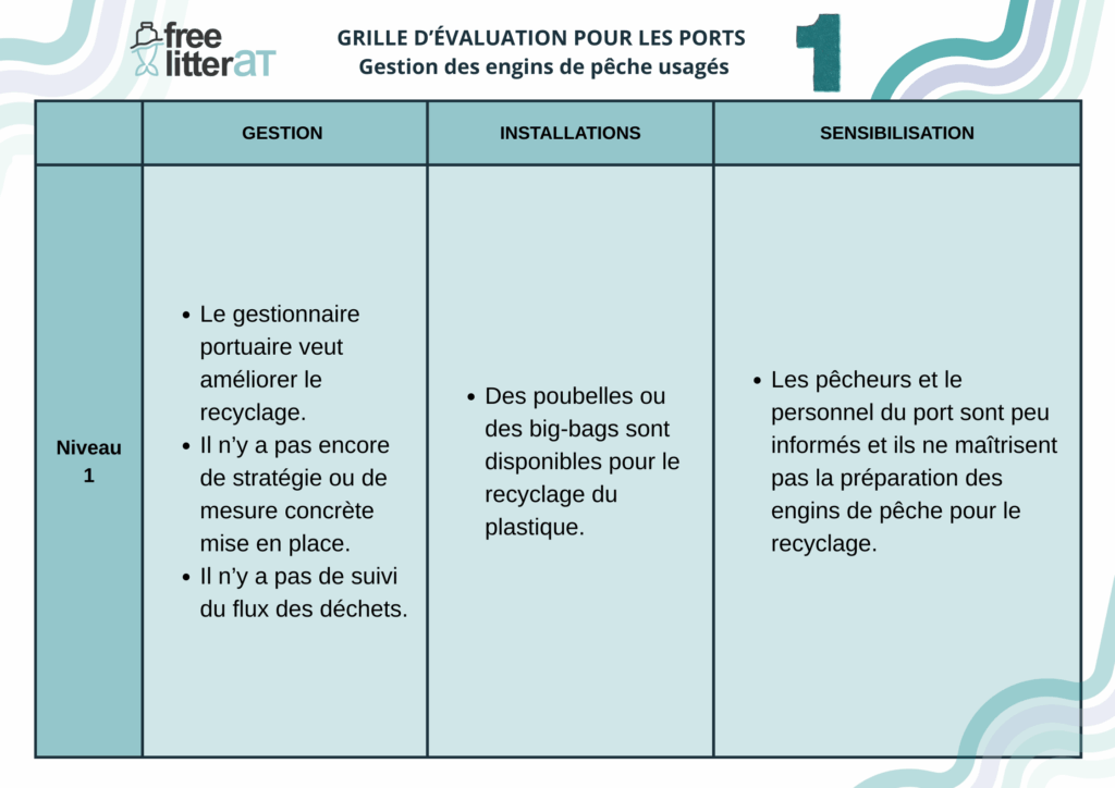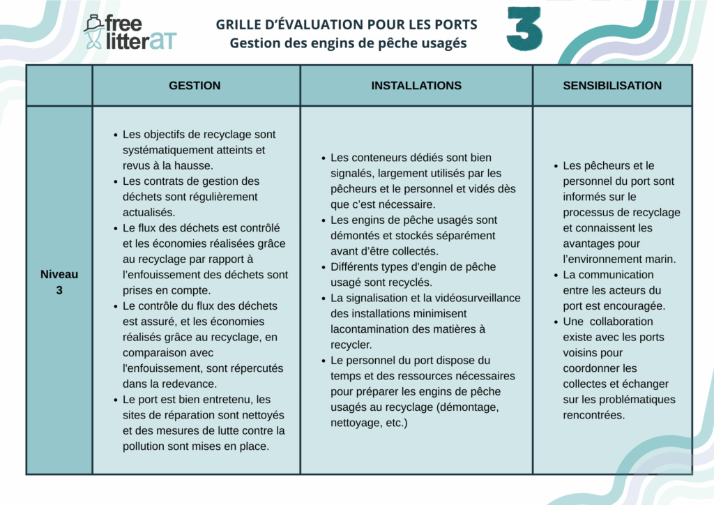 Cette grille d’auto-évaluation est adaptée du guide pour les ports sur le recyclage des engins de pêche développé par l’Université de Plymouth dans le cadre du projet INdIGO.